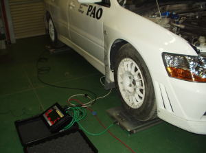 PAOではコーナーウェイトゲージを使い車両の重量を測る事が出来ます。 競技車は規定重量の指針としてお役立ちになります。 また、軽量化の方向性も見出せます。